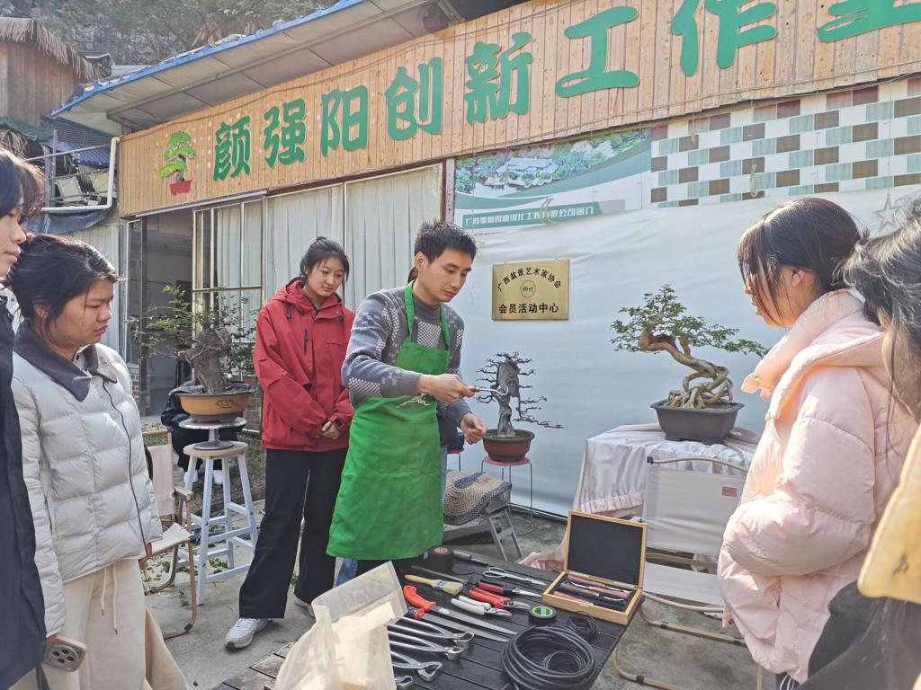 2026年1月7日,园林与城乡规划学院园艺技术专业学子在雷俊老师的带领下,走进校友颜强阳创新工作室,开展盆景设计与制作课程校外实习。作为广西技术能手、广西风景园林学会花木盆景赏石专业委员会副秘书长,颜强阳校友以实操教学的方式,为同学们带来了一场沉浸式的盆景艺术盛宴。