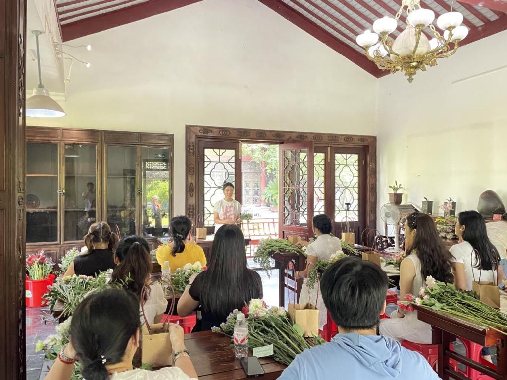 在教学环节中,花艺队成员结合实物花材,从花材的品种特性、插花知识及技法、色彩搭配等方面,向在场市民进行了细致讲解,并逐步演示修剪、固定、造型等实操步骤,手把手指导处理花材、设计造型。